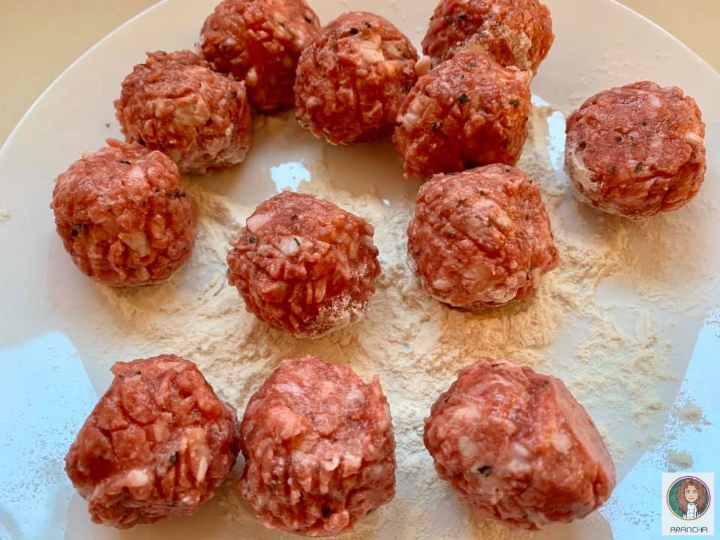 Ahora que las tenemos hechas, toca pasarlas por harina, no os pongo la cantidad porque el rebozar es a demanda, vas echando conforme vayas acabando la harina. Una vez tenemos todas las bolas de carne vestidas de harina nos toca freírlas. Recuerda, fríe a fuego medio porque si no se te quemarán por fuera y quedarán crudas por el interior ¿Cuándo estarán?
