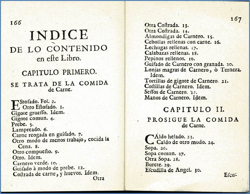 Recoge una receta de albóndigas hechas con «carne picada de cerdo o carnero añadiendo de huevo batido y algo de harina para trabar y aligerar, que se fríen en manteca y sirven en un caldo grueso con sustancia y bien especiado.»