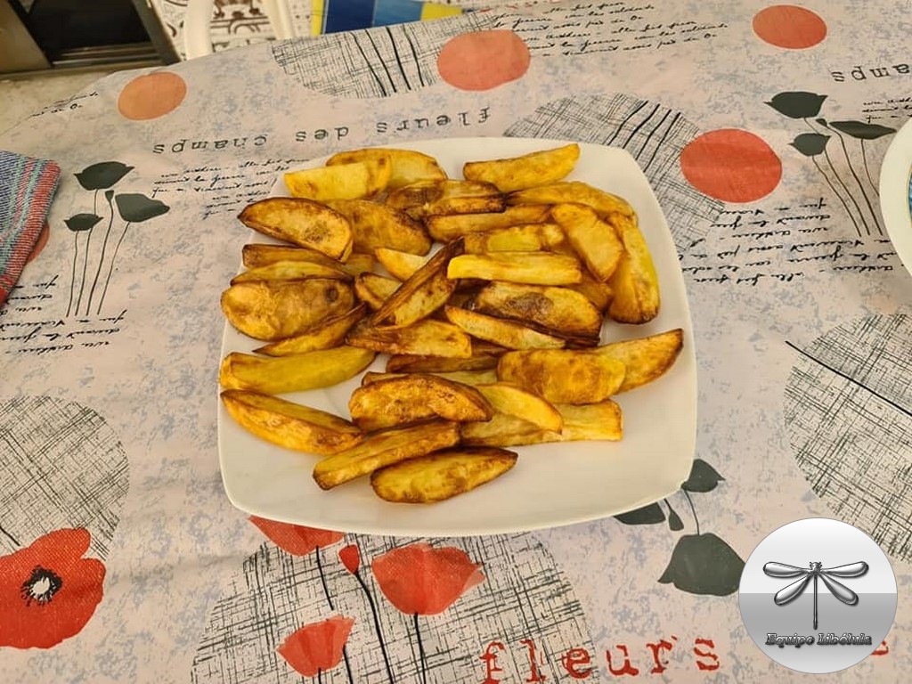 Lo acompañaremos de unas patatas gallegas que pelaremos y cortaremos en gajos de bocado y a freírlas bien. Y no hay más que añadir que un ¡buen provecho!